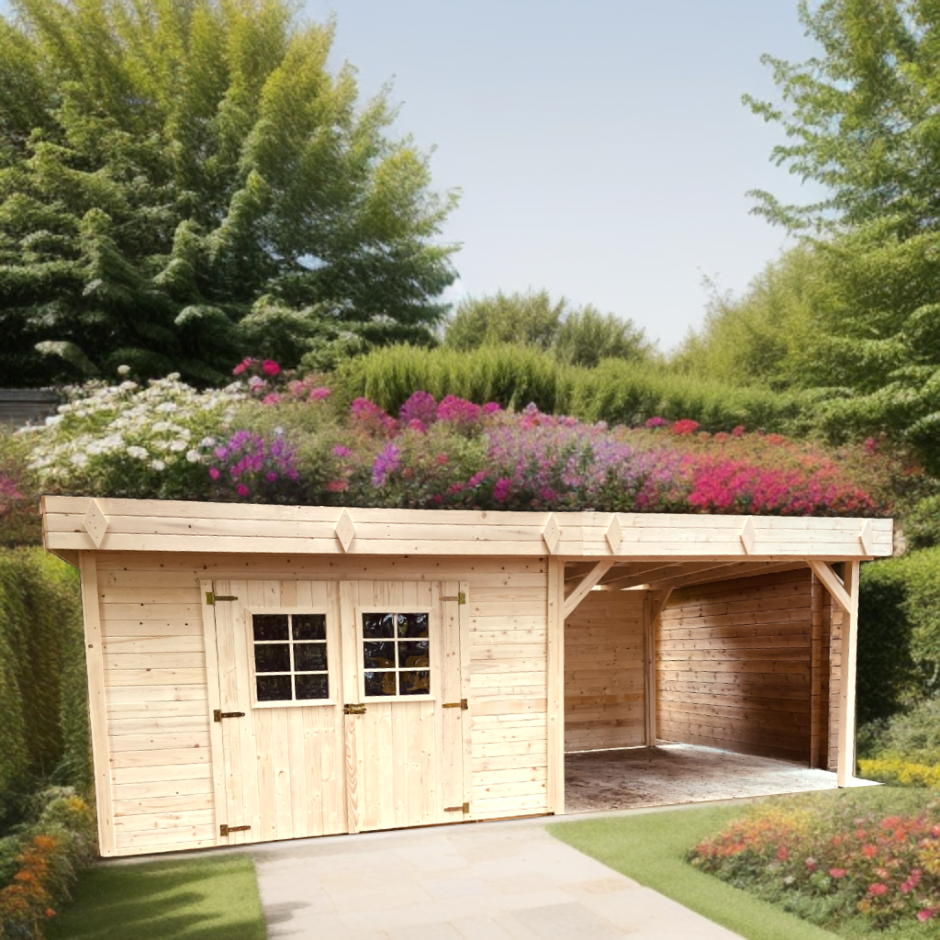 L'Abri avec terrasse Madriers massifs 28 mm toit plat avec bac acier est un choix idéal pour ceux qui cherchent à combiner esthétique moderne, fonctionnalité et durabilité avec une terrasse couverte pour profiter de l'extérieur.