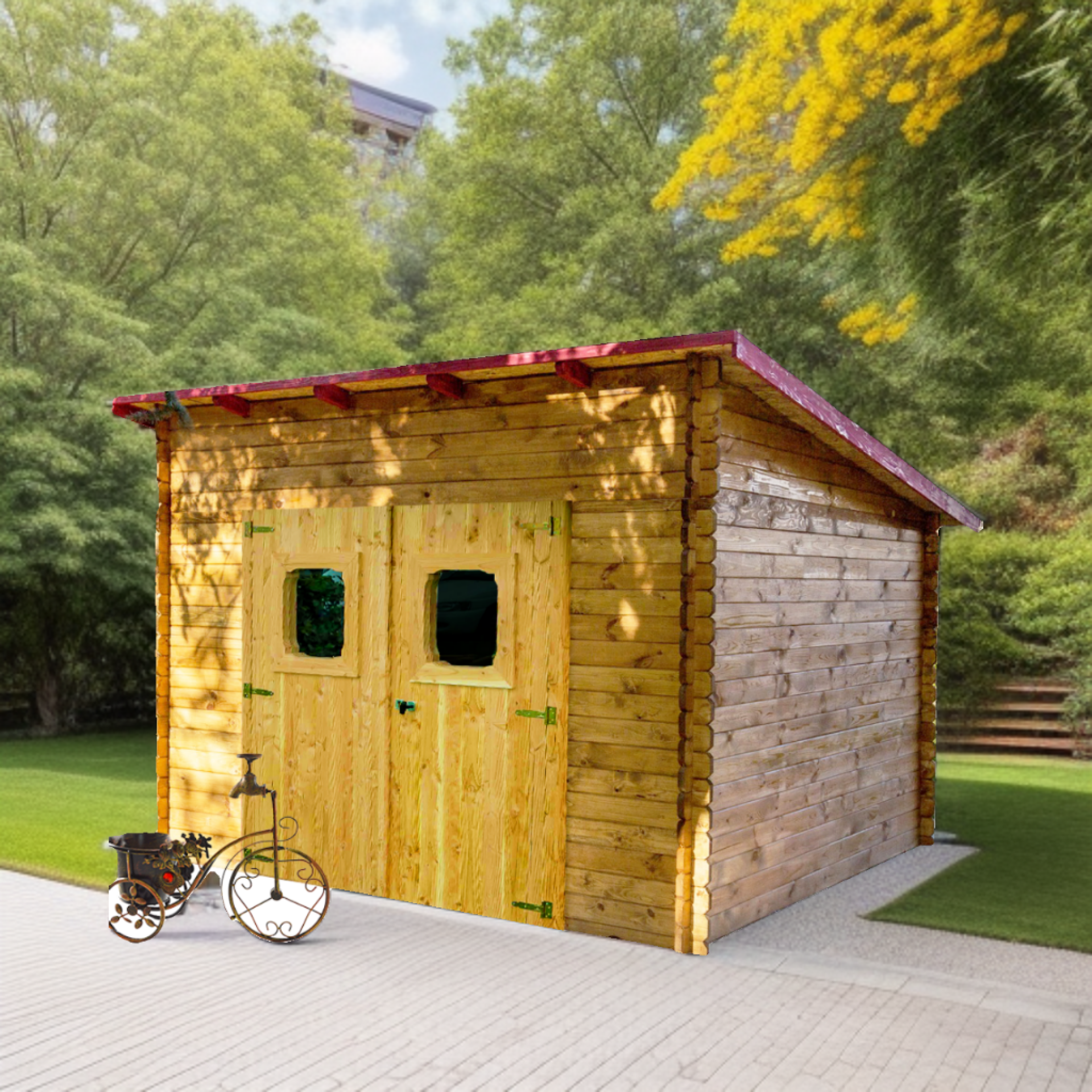 - Abri en bois naturellement durable et résistant, ne nécessitant