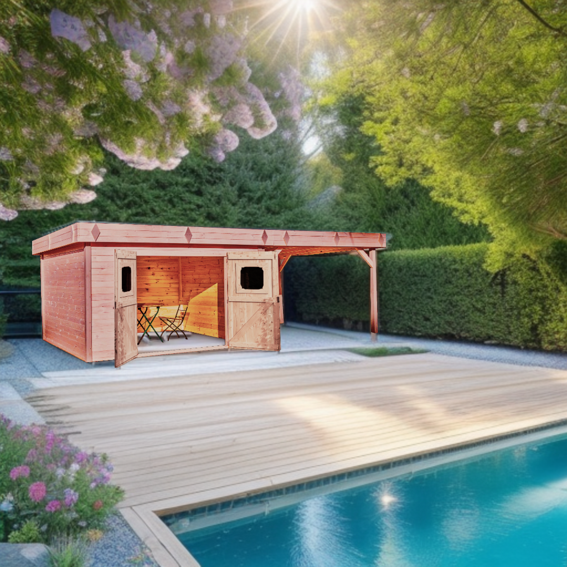 - Abri en bois naturellement durable et résistant, ne nécessitant