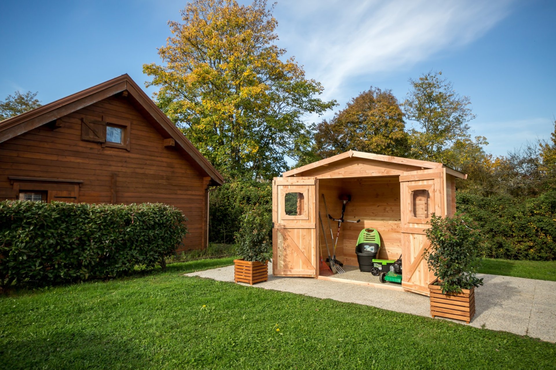 - Abri en bois naturellement durable et résistant, ne nécessitant
