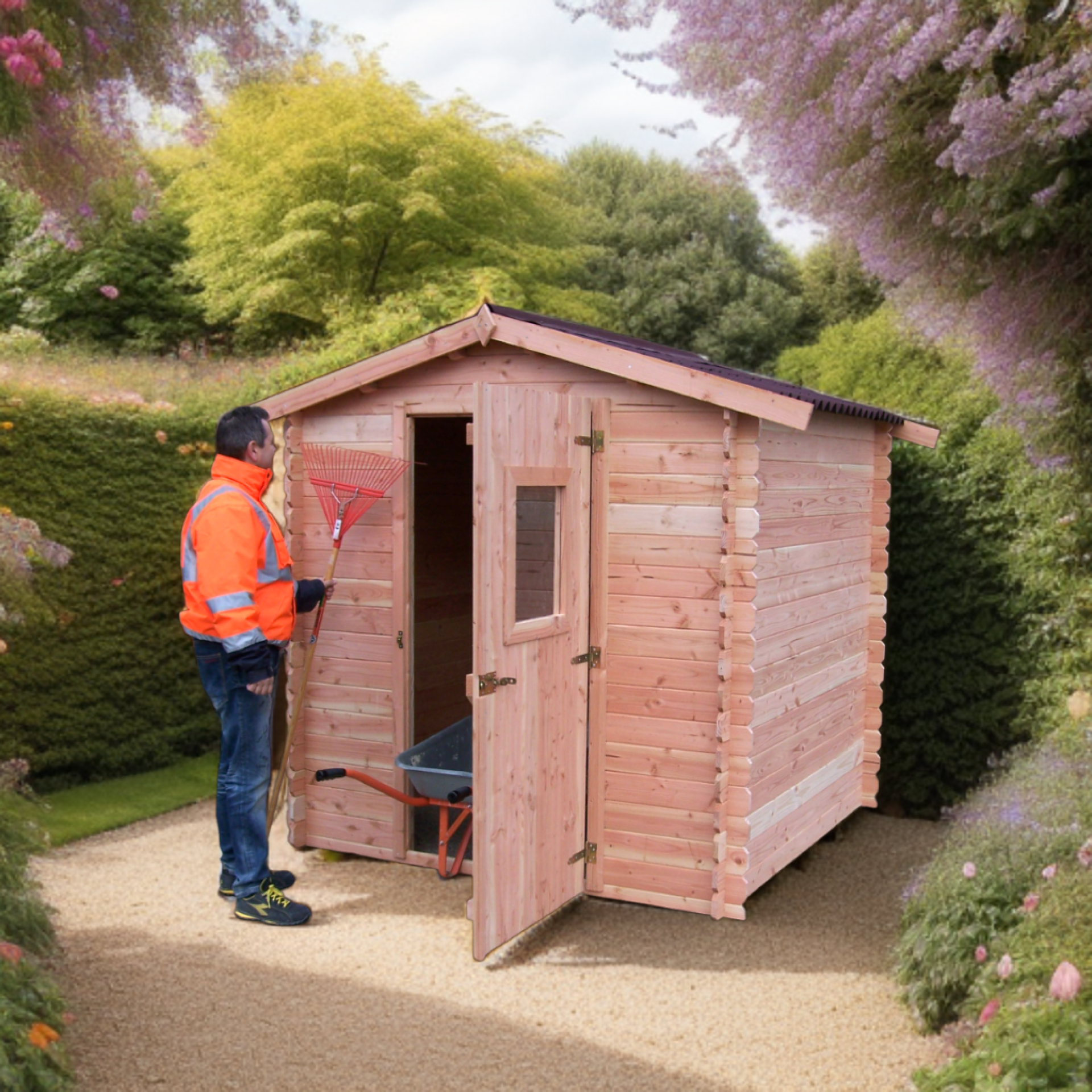 L'Abri Dublin double pente en Douglas est un produit en bois naturellement durable et résistant, ne nécessitant pas de traitement chimique. Il est fabriqué avec des madriers de 28mm d'épaisseur et est peu sensible aux attaques des insectes. Il offre une finition de belle qualité, avec un aspect brun-rosé qui s'intègre parfaitement dans tous les jardins. Le système de construction traditionnel garantit un assemblage solide et étanche pour une utilisation durable. Il est livré sans plancher, mais avec des plaques ondulées, vous permettant de l'aménager selon vos besoins. Il est important de noter qu'il doit être installé sur une dalle béton pour garantir une stabilité et une longévité maximales. L'abri est adapté pour un usage domestique, rangement produits non dangereux. Il est recommandé d'appliquer un saturateur pour préserver le bois (intérieur et extérieur) et maintenir son apparence naturelle.
