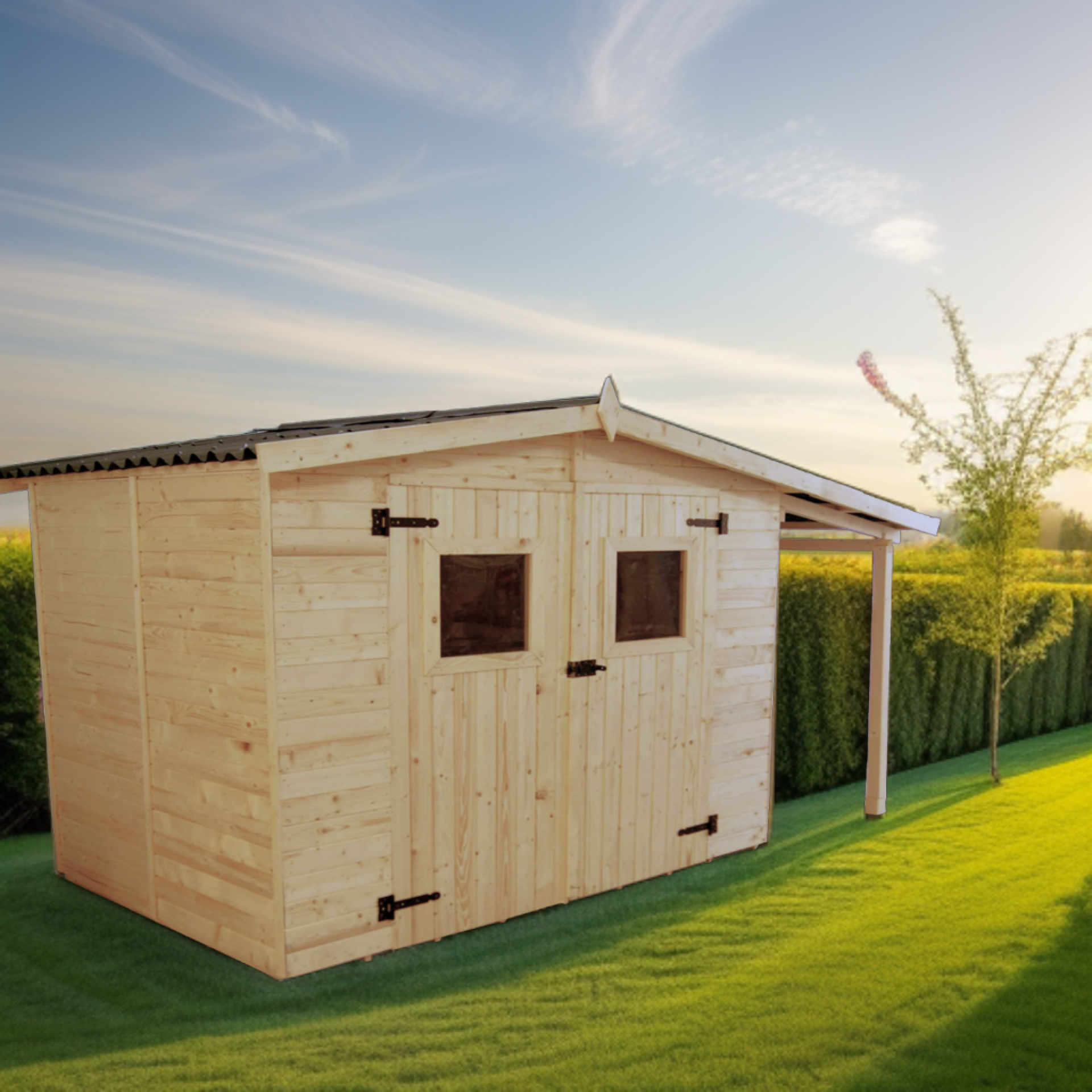 Abri Eden avec bucher, Epicéa panneaux 16mm, 3.70 x 1.90m, 5.80m²