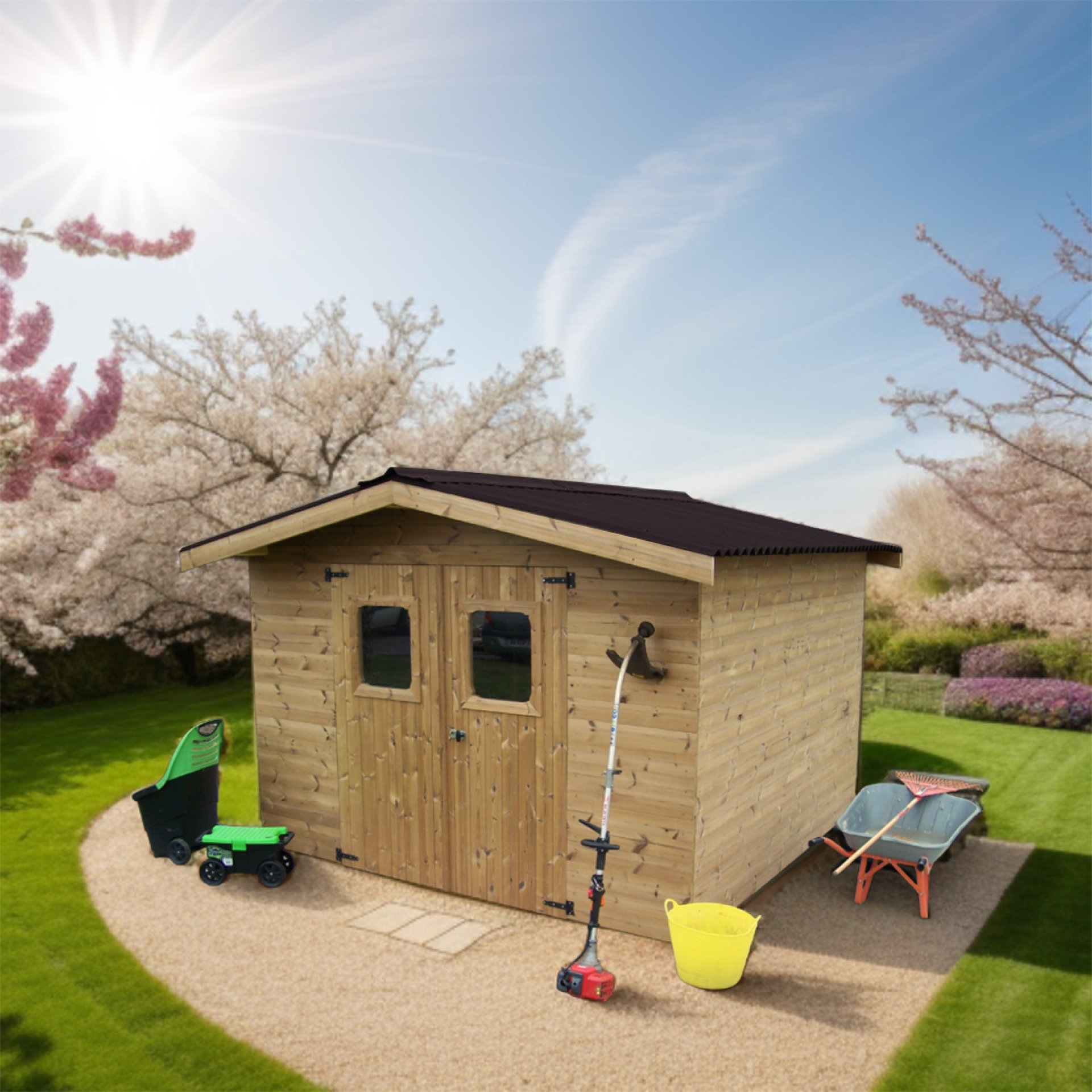 L'Abri Thermabri double pente en bois thermochauffé est un produit conçu pour offrir une grande résistance et durabilité. Les madriers utilisés dans sa fabrication sont de 28mm d'épaisseur, et ont été soumis à un traitement 100% naturel à 215°C, ce qui garantit une stabilité dimensionnelle des pièces de bois et une respect de l'environnement. Il est très facile à entretenir et convient pour un usage domestique, rangement produits non dangereux. Il est livré d’origine avec un kit de soubassement pour permettre une installation sur une dalle béton et garantir une stabilité et une longévité maximales. La construction de cet abri est basée sur un système de connexion angulaire, lui donnant un style moderne. Il est livré sans plancher, mais avec des plaques ondulées, vous permettant de l'aménager selon vos besoins. Il est important de protéger le bois en l'appliquant un saturateur ou une huile de bardage pour préserver sa belle apparence.