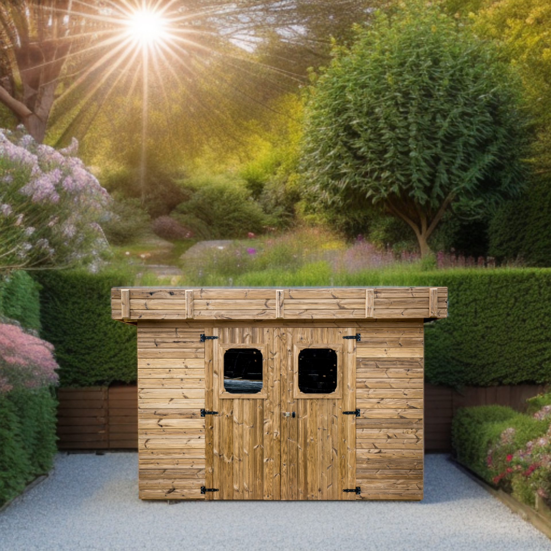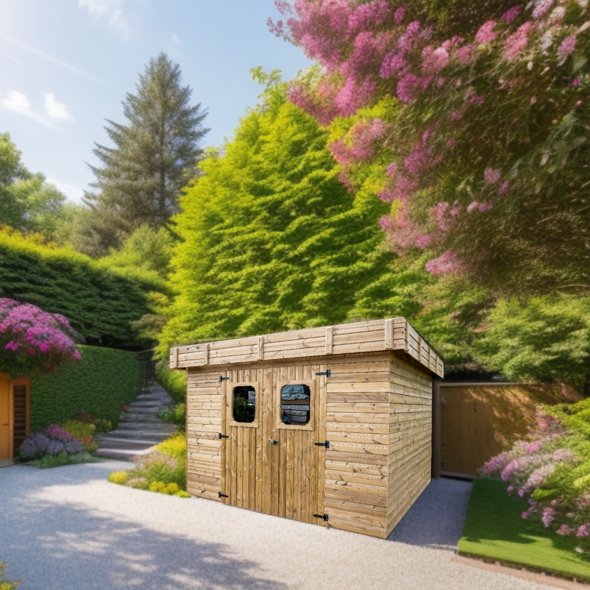 L'Abri Thizy toit plat en bois thermochauffe est fabriqué en panneaux et ne comprend pas de plancher. Il est doté d'un toit en bac acier pour une meilleure résistance et durabilité. Il est également soumis à un procédé de traitement 100% naturel dans un four à 215°C, ce qui permet une plus grande stabilité dimensionnelle des pièces de bois et respecte l'environnement. Il requiert très peu d'entretien et possède un système de construction par connexion angulaire et un toit plat pour un style moderne. Il est livré d'origine avec un kit de soubassement et doit être installé sur une dalle béton. Il est destiné à un usage domestique pour le rangement de produits non dangereux. Il est recommandé d'appliquer un saturateur ou une huile de bardage pour préserver le bois.