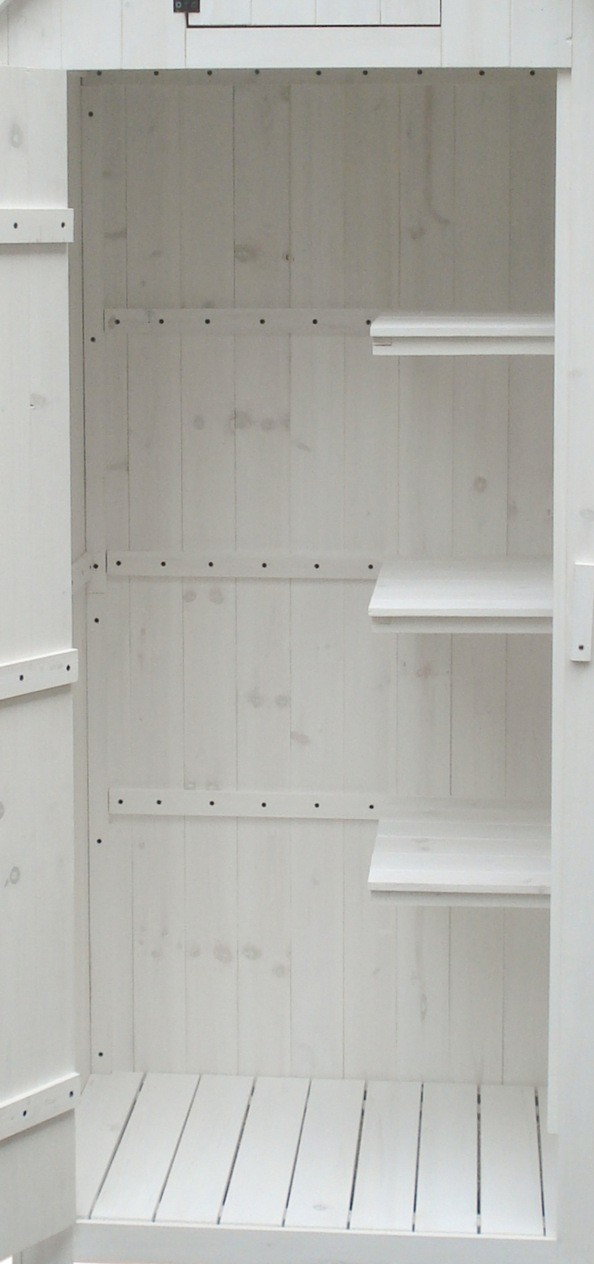 3 étagères de rangement sur le côté . Rangement vertical pour les outils de jardin longs . Rangement sous le toit . Loquet de fermeture en bois . Porte dimensions 52 x 125 cm épaisseur 3 cm