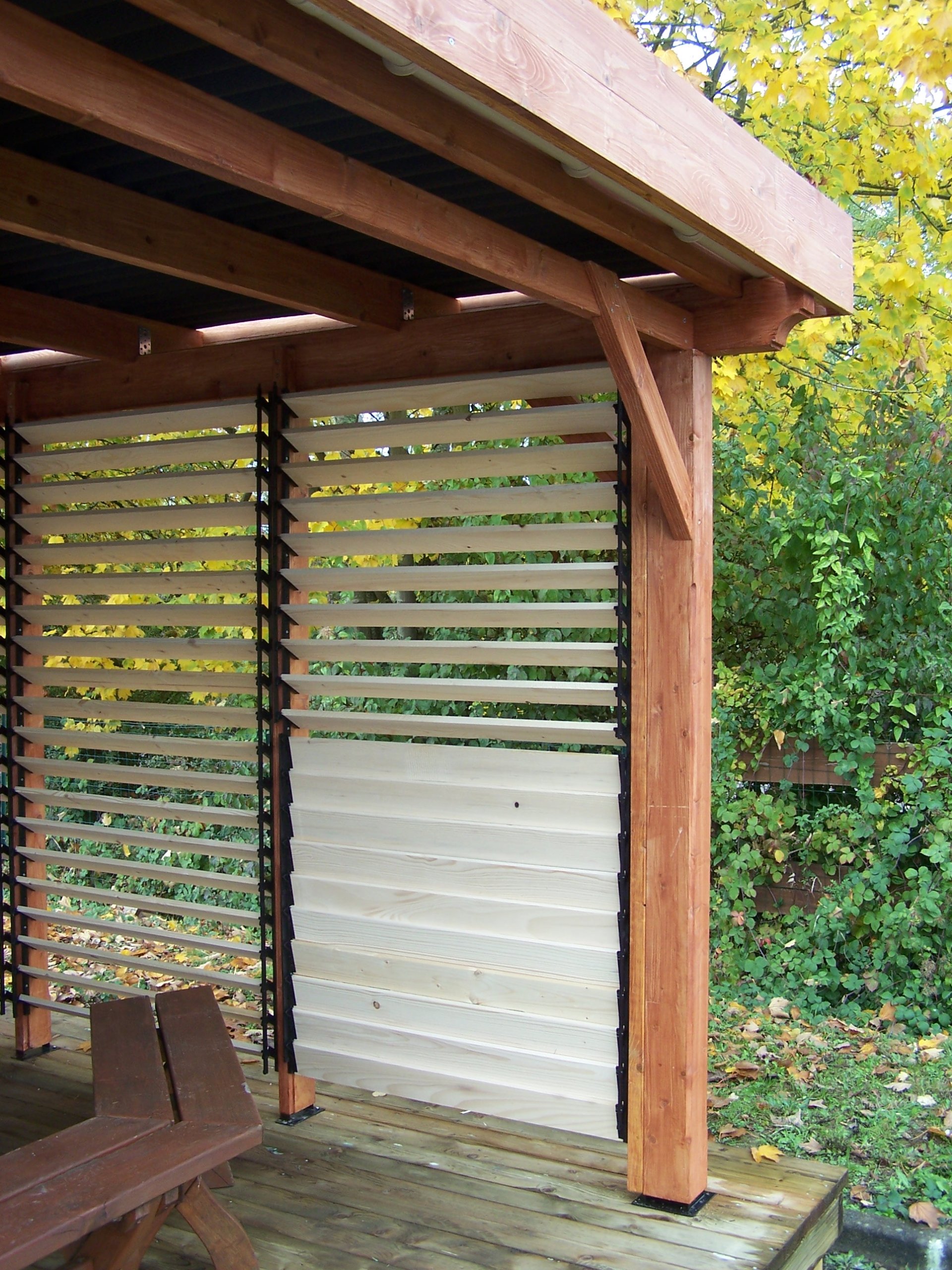 Afin d’obtenir la fermeture d’une paroi latérale nous proposons des brise vues à claire voie avec lames de bois orientables à fixer entre les poteaux. Le système permet de jouer avec les conditions climatiques et la fermeture pour protéger du soleil en toute simplicité en reprenant le principe des lames orientable du store vénitien. Ce système est fabriqué en France et breveté. Les lames orientables sont en bois section 95 x 20 mm. Ceci confère au système une résistance au vent et une durabilité dans le temps incomparables avec les autres systèmes existants.
