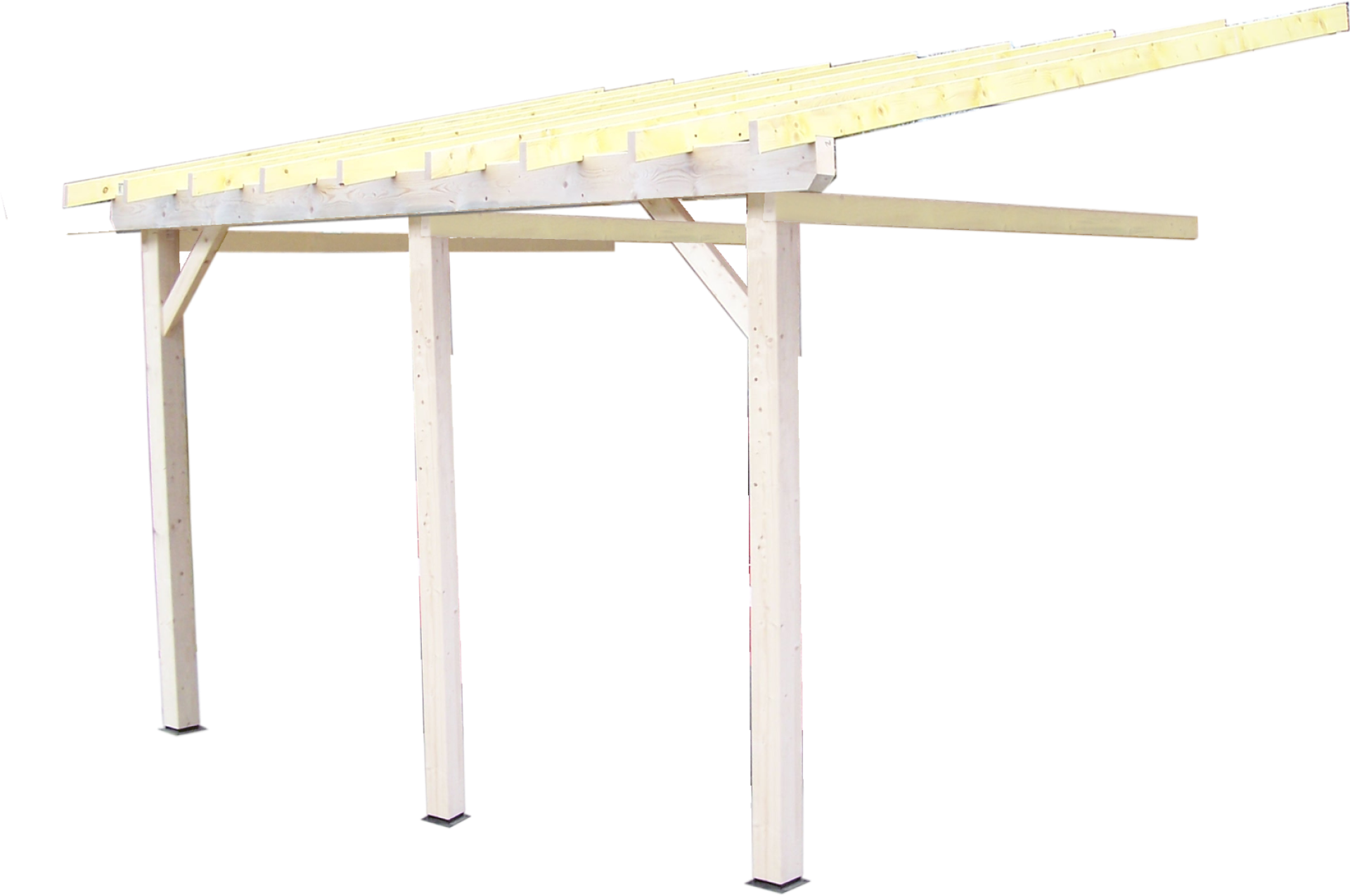 3 poteaux en épicéa du nord contrecollé, traité insecticide et fongicide CTBP+ incolore, raboté 4 faces et chanfreiné. Humidité max.: 15 %. Section 120 x 120 mm. 1 panne en bois de charpente (épicéa ou sapin massif), séché, raboté et traité insecticide et fongicide CTBP+ incolore, classe de résistance C24 assemblés avec liens en bois. Section 80 x 160 mm. Bois certifié PEFC. 1 poutre muraillère en bois de charpente (épicéa ou sapin massif), séché, raboté et traité insecticide et fongicide CTBP+ incolore, classe de résistance C24. Section 120 x 45 mm. 3 sablières transversales en bois de charpente (épicéa ou sapin massif), séché, raboté et traité insecticide et fongicide CTBP+ incolore, classe de résistance C24 avec sabots métalliques côté mur. Section 120 x 45 mm. Poteaux livrés avec platine métallique à fixer au sol dur. Système de fixation contre le mur non-fourni.