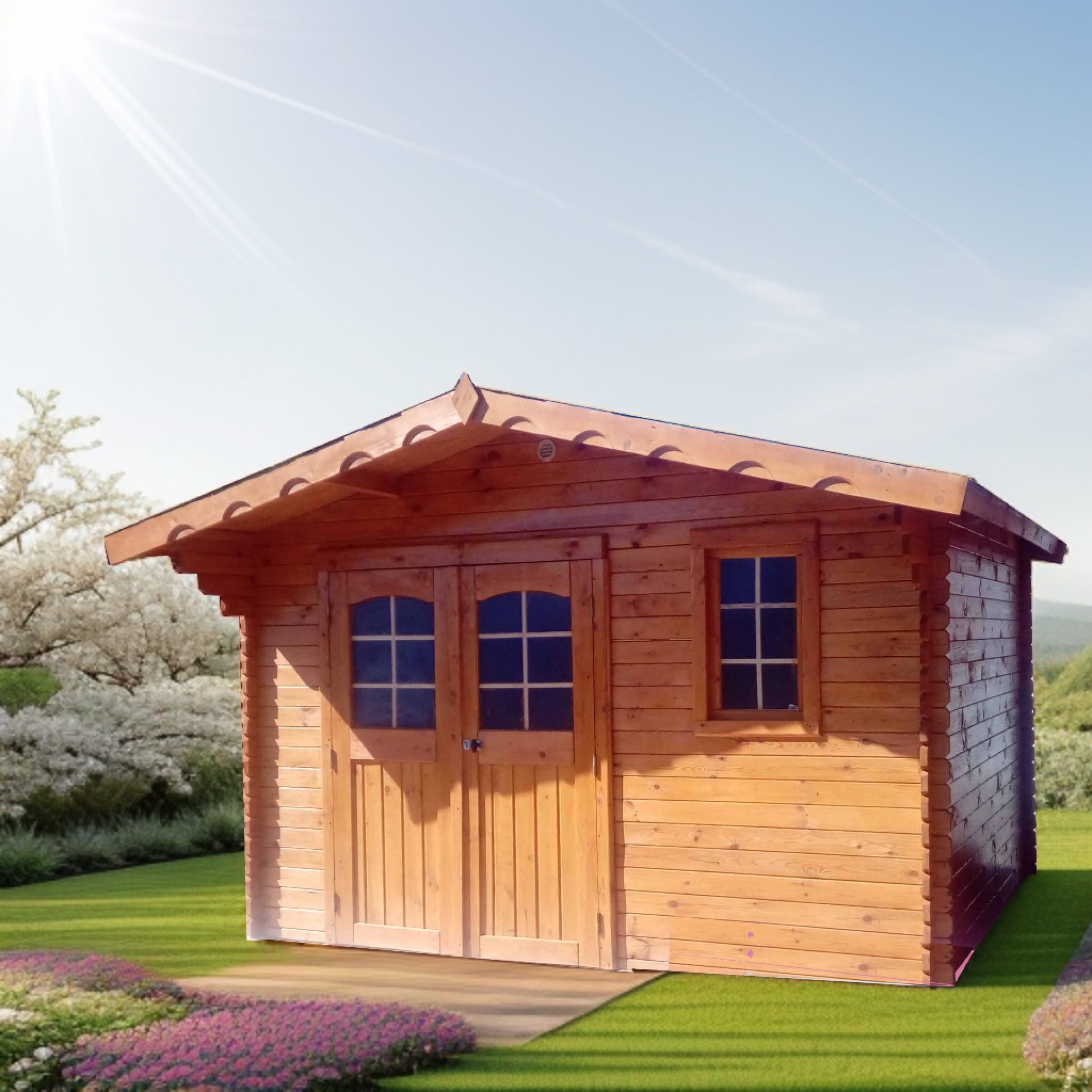 L'Abri Madriers massifs 28mm est un abri avec une grande hauteur de faitage qui donne un abri bien proportionné. Il possède une grande avancée de toit par rapport à un abri standard. Il est livré avec une double porte menuisée assemblage tenon mortaise de grande taille de 1,80 m, une fenêtre basculante en façade, un feutre bitumé Onduchape de chez ONDULINE, une toiture en voliges bois massif, des planches de rives voliges larges. Il est fabriqué en Europe et est certifié PEFC. Il doit être installé sur une dalle béton obligatoirement.