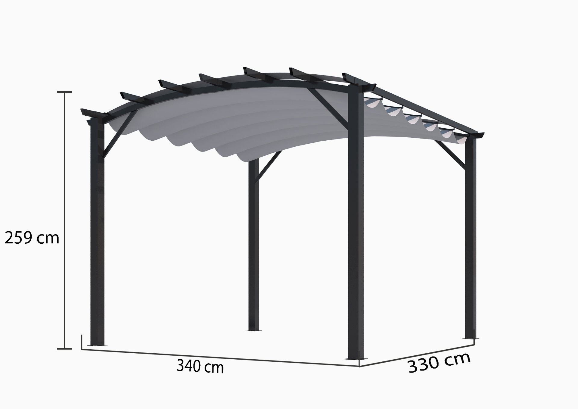 Pergola arche, structure mixte aluminium/acier coloris gris anthracite toile couleur gris, 3.40 x 3.30 m, 11.20m²