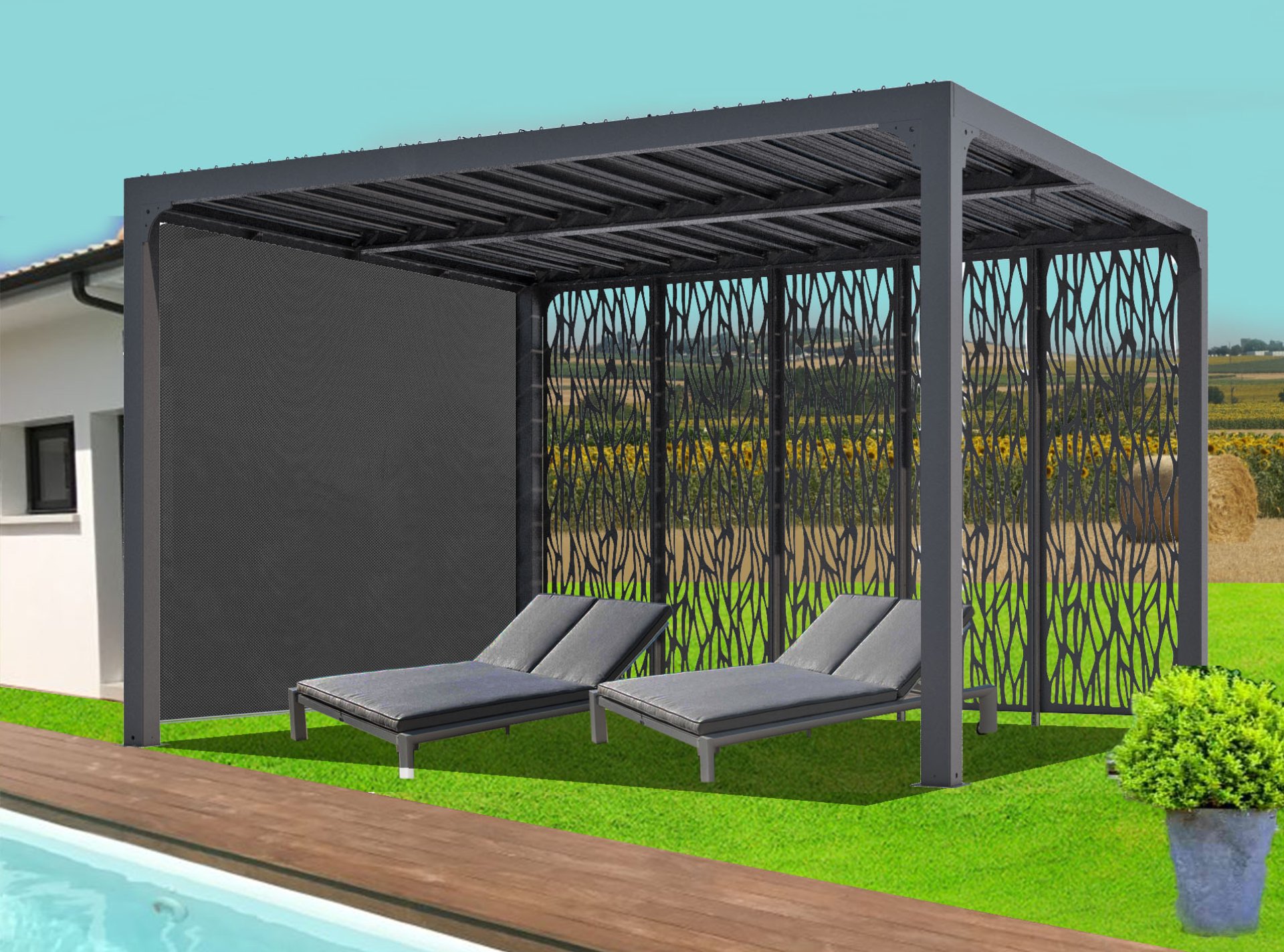 Pergola bioclimatique avec panneaux moucharabieh coloris gris pour côté 3,60 m et rideau manuel coloris gris pour côté 3 m, Aluminium gris anthracite, 3.60 x 3.00 m, 10.80m²