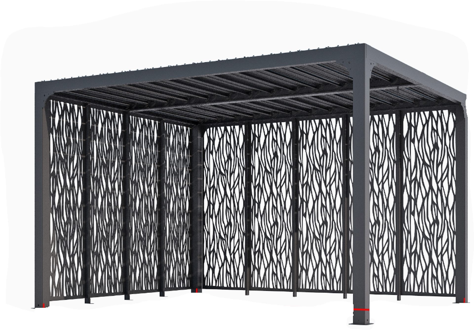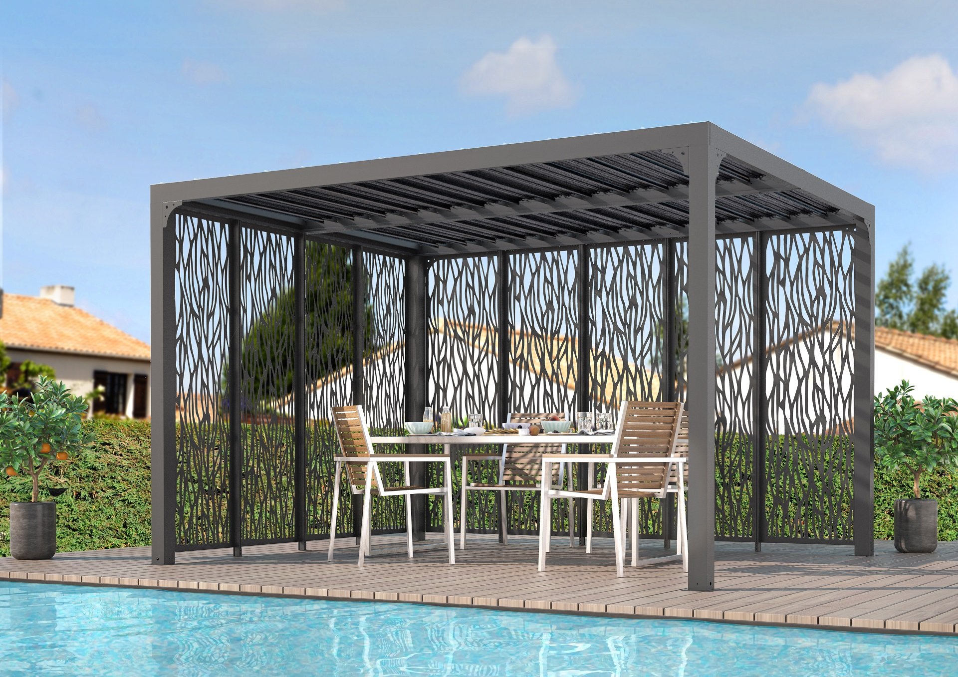 bioclimatique PER 3630 BI, ces 9 panneaux, véritables écrans en acier époxy, apportent un coin d’ombrage, qui diminuent les effets d’un soleil tonique, et