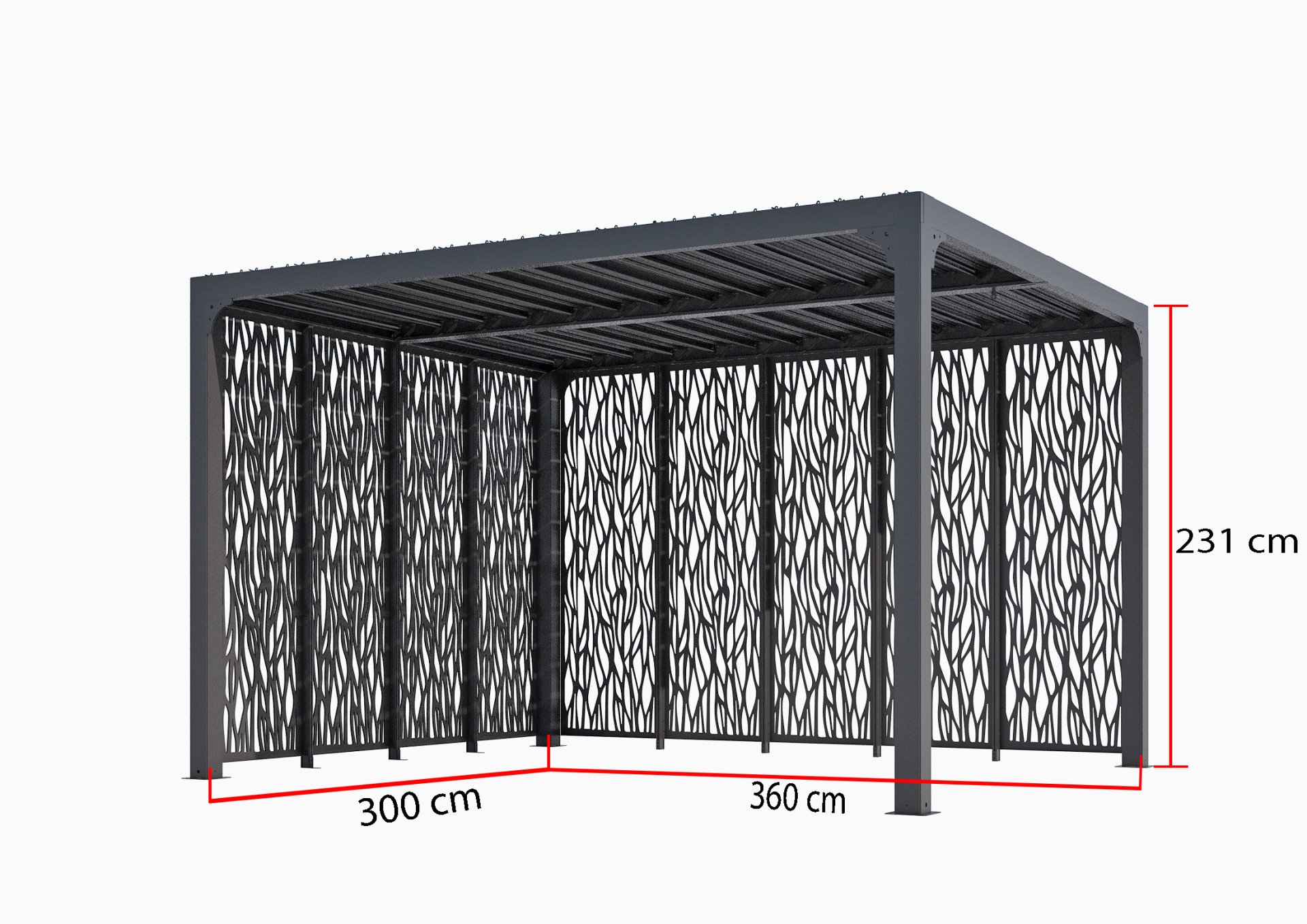Pergola bioclimatique avec panneaux moucharabieh coloris gris pour côté 3 m + côté 3,60 m, Aluminium gris anthracite, 3.60 x 3.00 m, 10.80m²