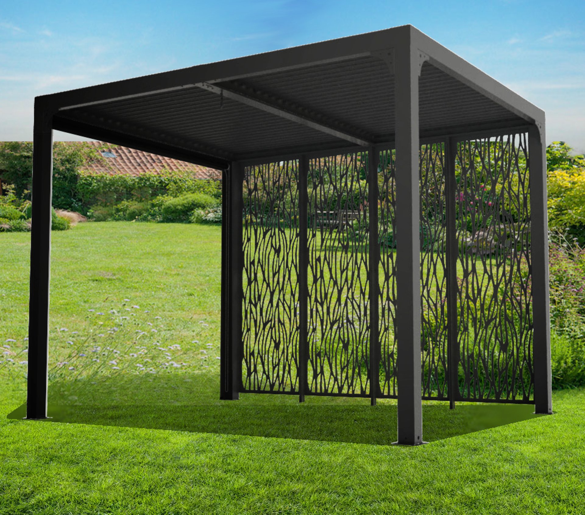 moucharabieh. Installés sur le côté de 3 mètres de la pergola bioclimatique, ses 4 panneaux, véritables écrans en acier thermolaqué, proposent