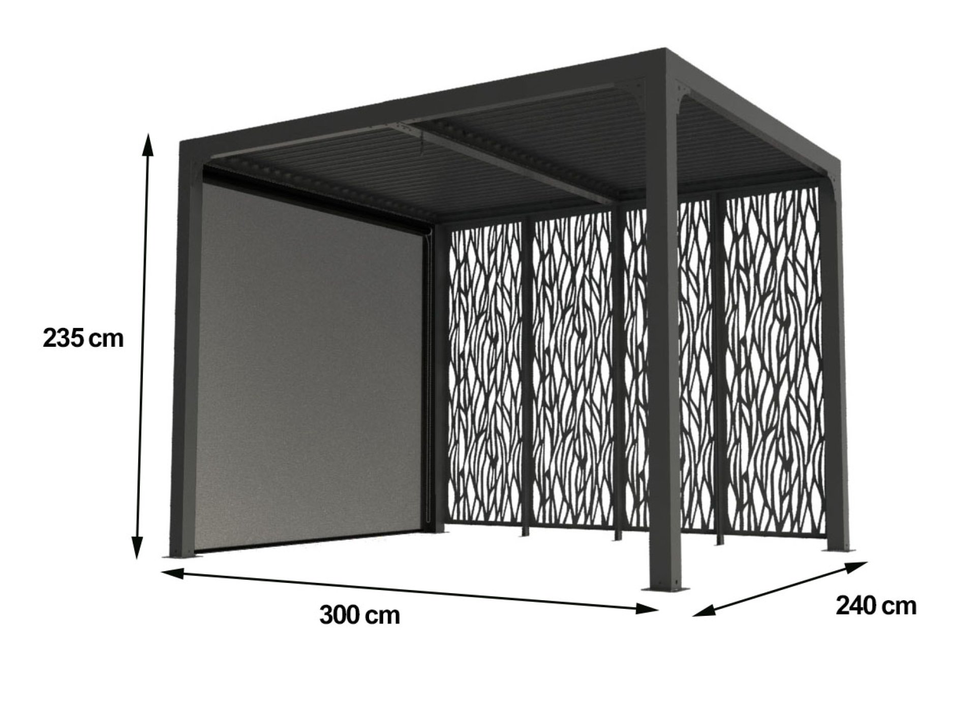 Pergola bioclimatique Aluminium avec 4 panneaux moucharabieh coloris gris pour côté 3 m et rideau manuel coloris gris pour côté 2,40 m, 2.40 x 3.00m, 7.20m²