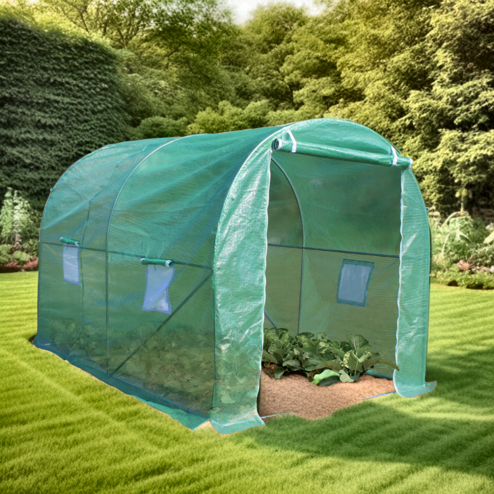 fenêtres d'aération latérales à grilles anti-moustiques, la bâche en polyéthylène de 140 gr/m2 est de coloris vert, pour